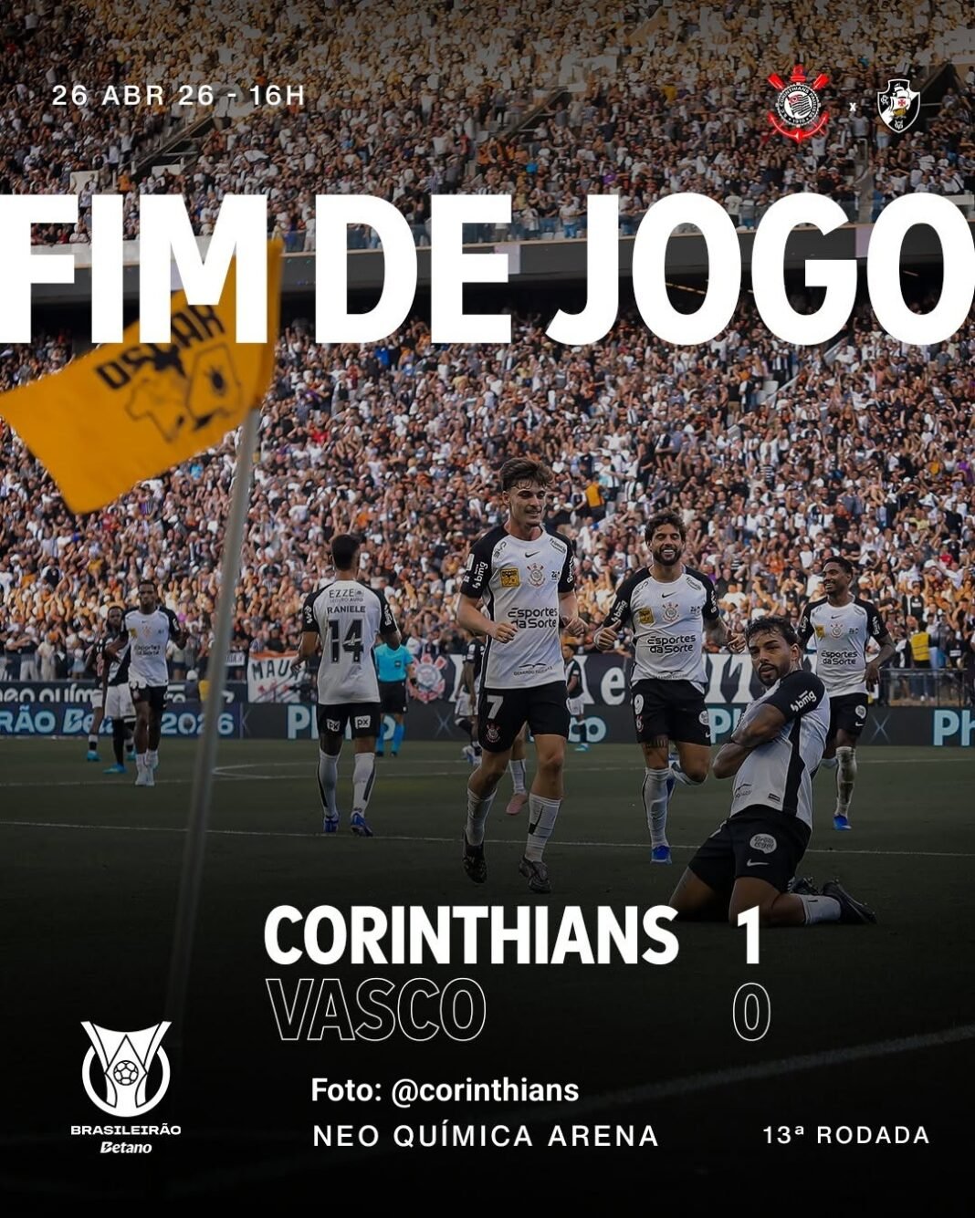 Com o resultado, o Corinthians chega aos 15 pontos, ocupa a 14ª posição e amplia a distância para a zona de rebaixamento, empurrando o Santos para o Z4. Já o Vasco permanece em 10º lugar, com 16 pontos.